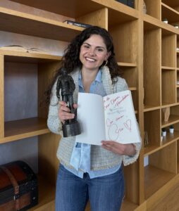 Celia Martínez, behind the scenes of her interview, holding a Chavez Legacy Award and her book of poetry.